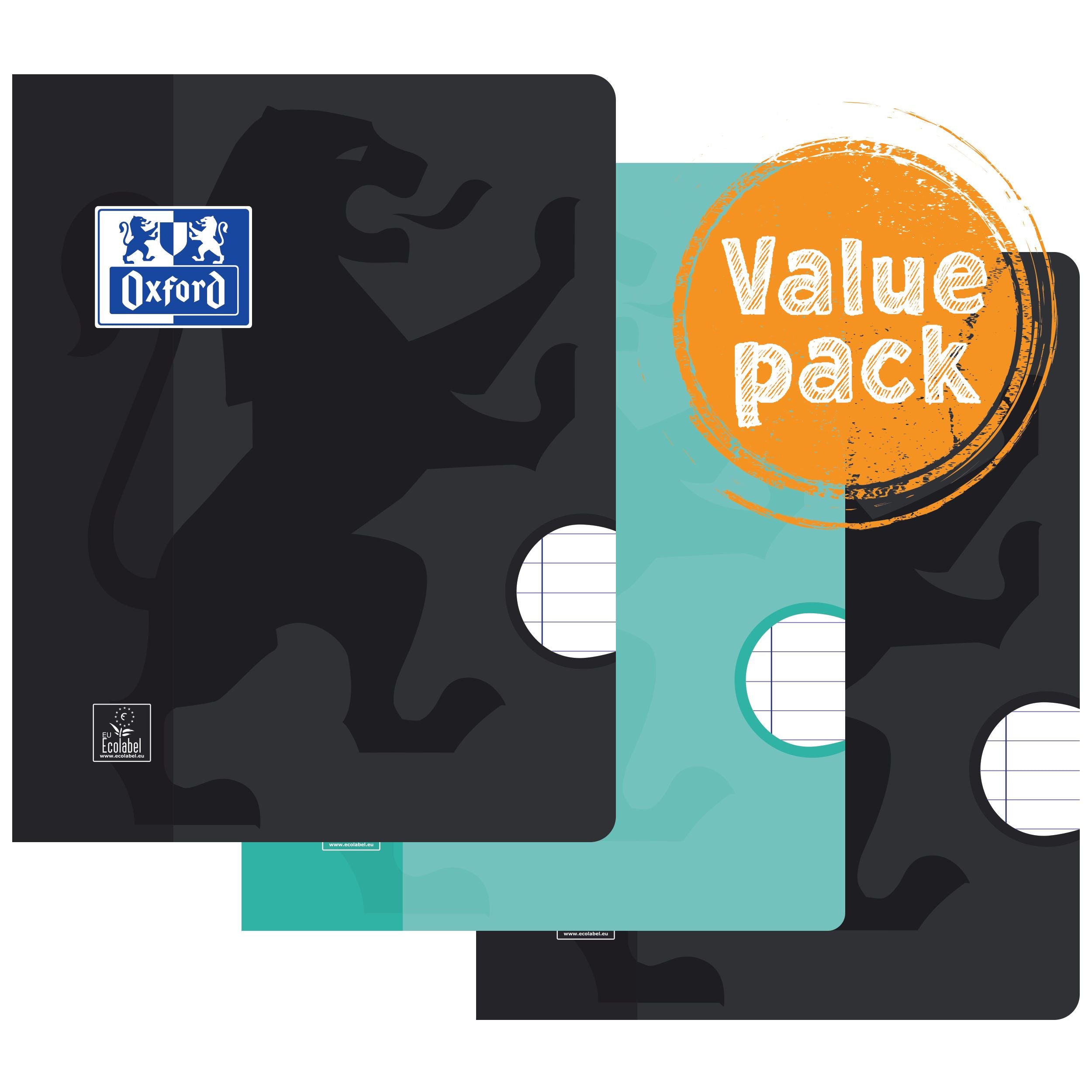 * Een voordeelpak met daarin drie Oxford A4 schriften, twee zwarte en een turquoise.