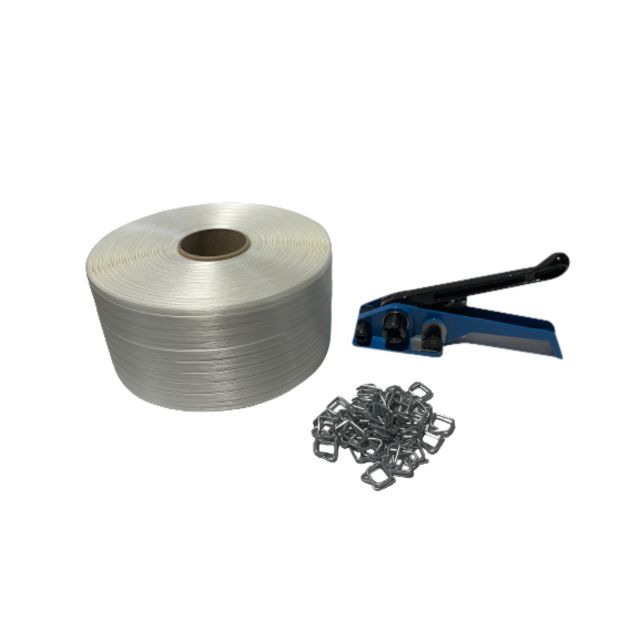 *Inclusief handspanner, rol textielband 13 mm x 1100 meter, 100 gespen.